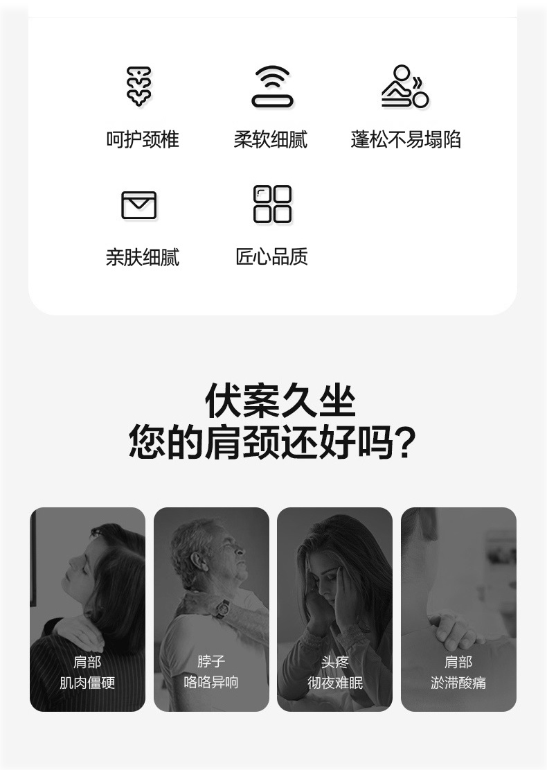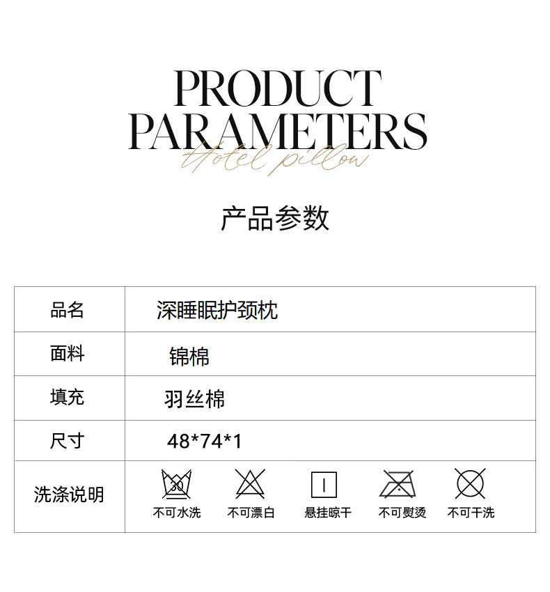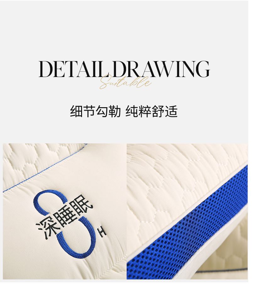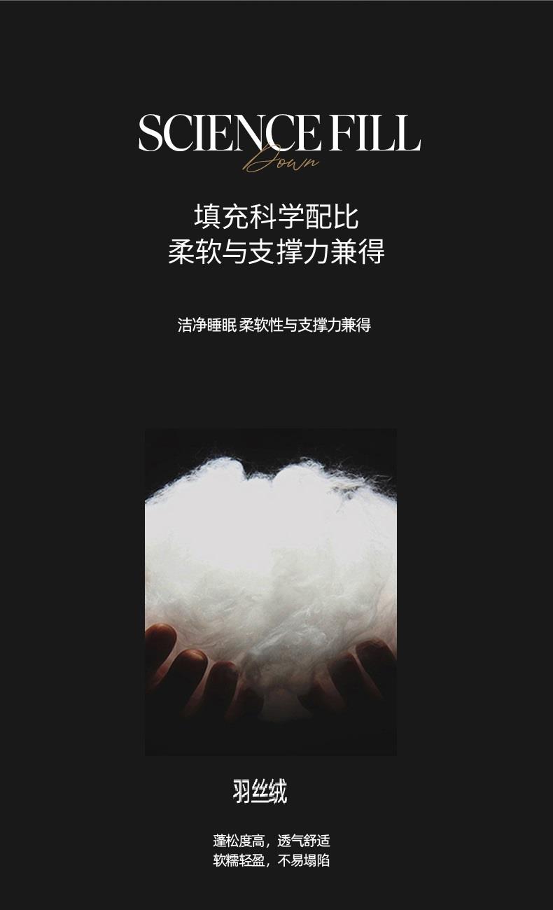 规格:48*74cm *1 面料:锦棉 填充物:羽丝棉 克重:700g 产品包装:精美礼盒 产品特点: 1.面料柔软舒适、细腻柔光、吸湿性和透气性强。 2.功能分区,全面呵护。人体工学设计由点到面,减负头、颈、肩,让每一次睡眠都倍感轻松。