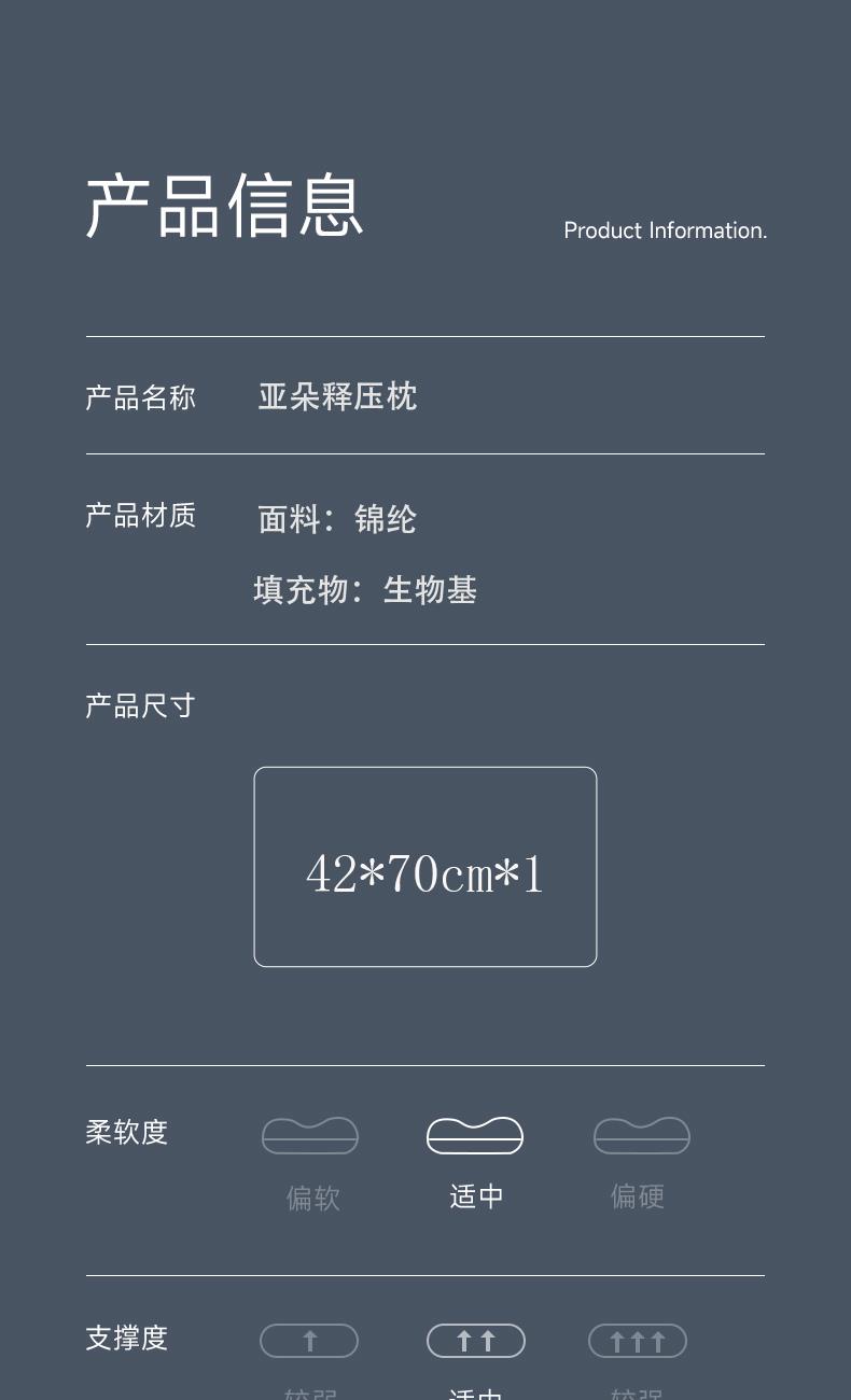规格:42*70cm*1 面料:锦纶 填充物:生物基 克重:1000g 产品包装:精美手提袋 产品特点: 1.锦纶面料具有良好的弹性和回弹性,不易变形;强度高、而磨性强、轻盈舒适。 2.生物基面料低碳环保,有优异的吸湿透气性能。
