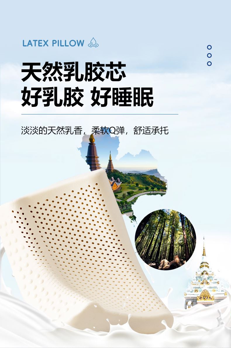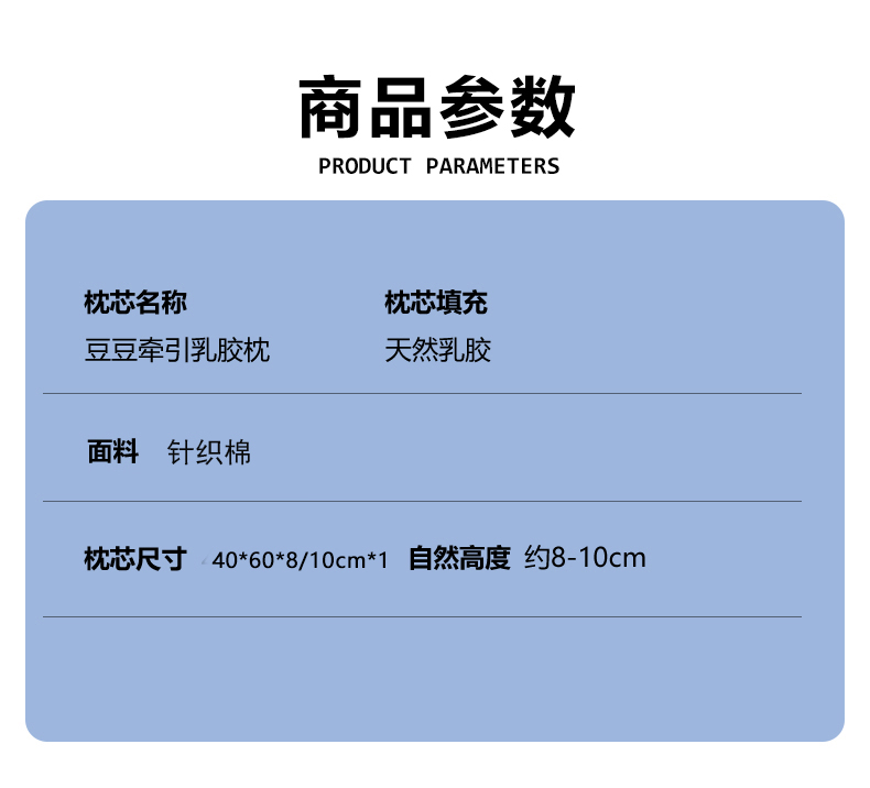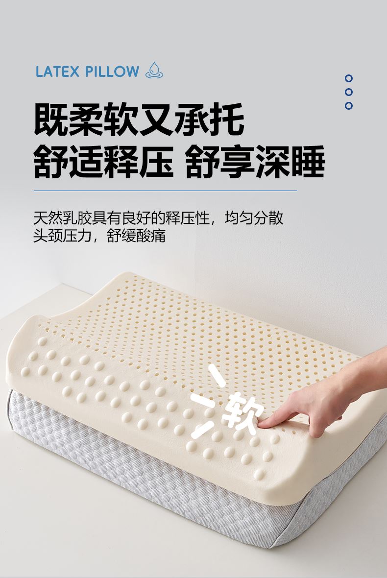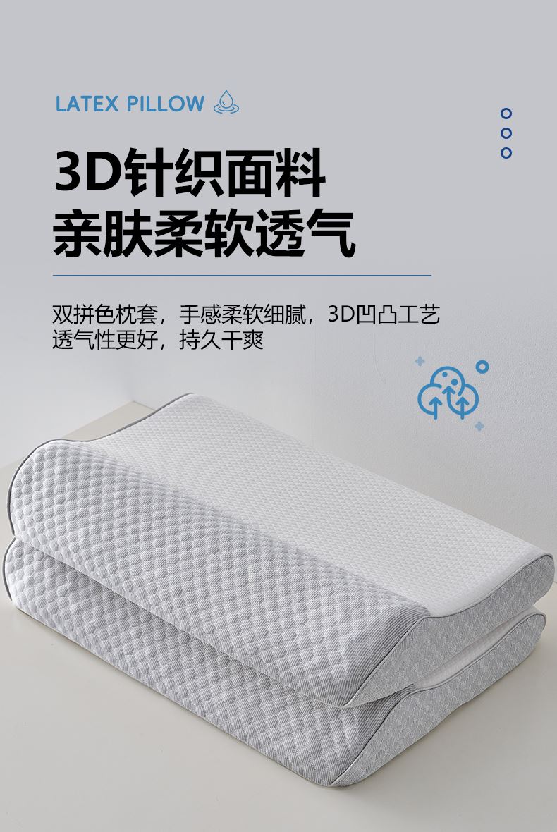 规格:40*60*8/10cm *1 面料:针织棉 填充物:天然乳胶 克重:1000g 产品包装:精美礼盒 产品特点: 1.天然乳胶是一种从橡胶树上提取的天然材料,具有环保、健康、舒适等特点。 2.乳胶枕具有舒适、支撑力好等特点。
